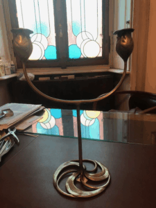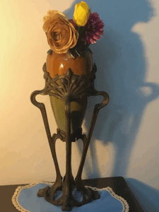 Abel Landry(1868 – 1923) along with Colonna, De Feure and Gaillard, was a major contributor to Samuel Bing’s ‘Pavillon Art Nouveau’ at the Paris 1900 Exhibition, and to La Maison Moderne. His works were accepted also at the International Decorative Exposition in Turin in 1902 His work is close to that of his fellow Parisian designers, but especially in his designs for metalwork, shows an influence of the work of Henry van de Velde. Landry’s ceramics are known for their Art Nouveau aestethic, featuring organic flowing lines and stylized floral motifs, as in the metallic structures sustaining the vases. The use of iridescent glaze and the inclusion of Landry’s signature at base of metallic and pewter works further enhance the decorative appeal, making them quintessential examples of his works.